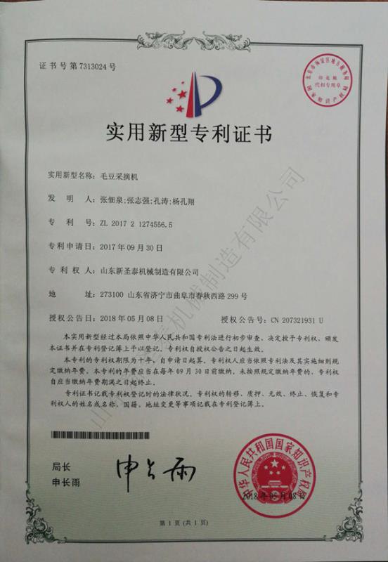 2)毛豆(dòu)采摘機(專利號201721274556.5)