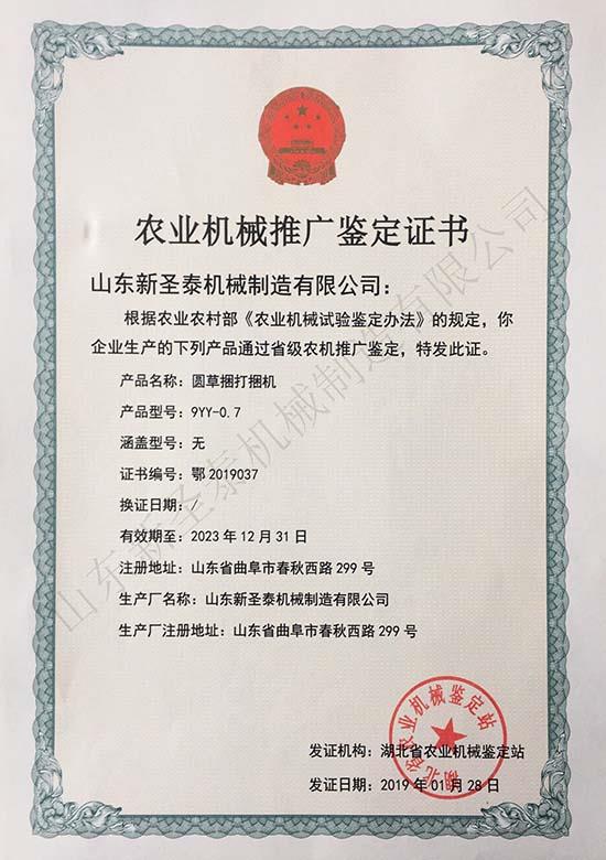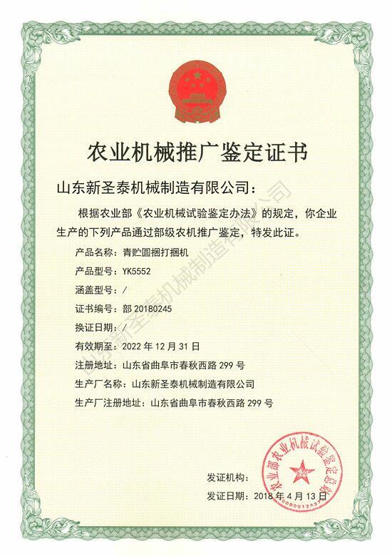 山東新WWW.91N.COM機械製造有限公(gōng)司,2018年YK5552型青貯圓捆打捆(kǔn)機獲得農機推廣鑒定證書(證書(shū)編號:部20180245),進入國家農(nóng)機補貼(tiē)目錄,為廣大農(nóng)戶和農業生產合作社購買打(dǎ)捆機享受到了國家農機補貼,更為農機經銷商提高了產(chǎn)品的市(shì)場競爭力。