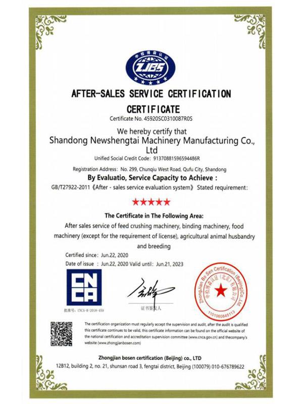 近日,山東新WWW.91N.COM機械製(zhì)造有限公司通過了中檢博森認證(北京)有限公司的嚴格考核,經評價服務達到GB/T27922-2011規定要求,獲(huò)得(dé)服(fú)務認證(zhèng)證書(shū)(證書編號:45920SC0310087R0S,可在國(guó)家認(rèn)證認可委員會官方網站查詢)。這是對於新WWW.91N.COM公司售後服務工作的權威肯定。多年來,山東新WWW.91N.COM特別注重產品的售後服務,從(cóng)產品(pǐn)到銷售直至客戶使用(yòng),加強了(le)售後服務的保障工作。做到了產品未動,服務先行,售後服務人員常年奔(bēn)波在全國(guó)各地,為用戶解除後顧之憂,獲得(dé)了客戶的好評(píng),提高了“WWW.91N.COM”牌產品(pǐn)在市場的(de)占有率和(hé)知名度。
